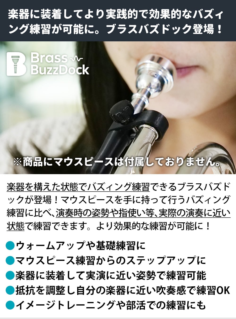 ■楽器に装着してバズィング練習できる「ブラスバズドック」登場!よりクオリティの高い練習が可能に。