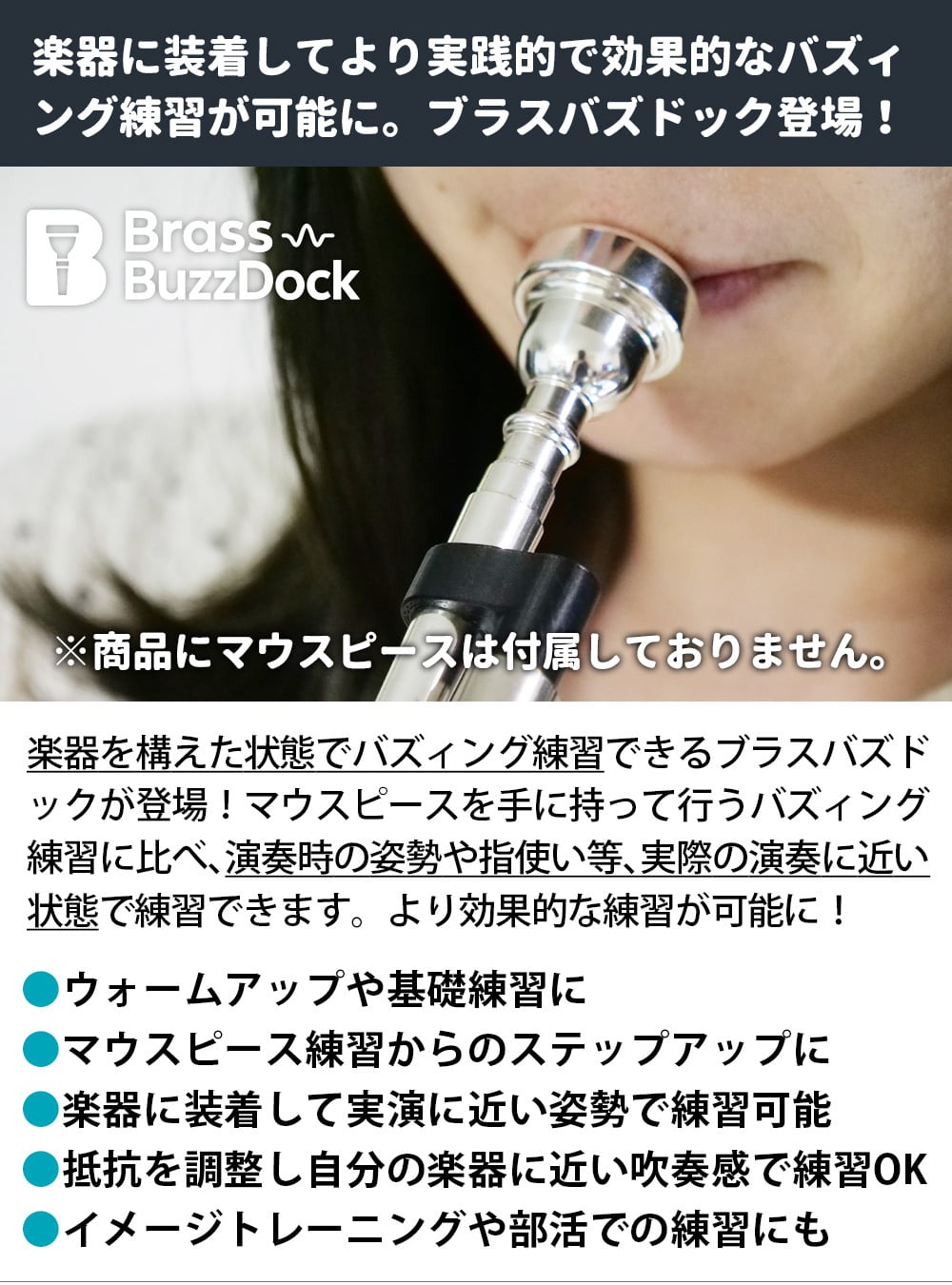 楽器を構えた状態でバズィング練習できるブラスバズドックが登場!マウスピースを手に持って行うバズィング練習に比べ、演奏時の姿勢や指使い等、実際の演奏に近い状態で練習できます。ウォームアップや基礎練習、マウスピース練習からのステップアップに。